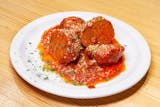 Homemade meatballs, marinara sauce and mozzarella cheese.